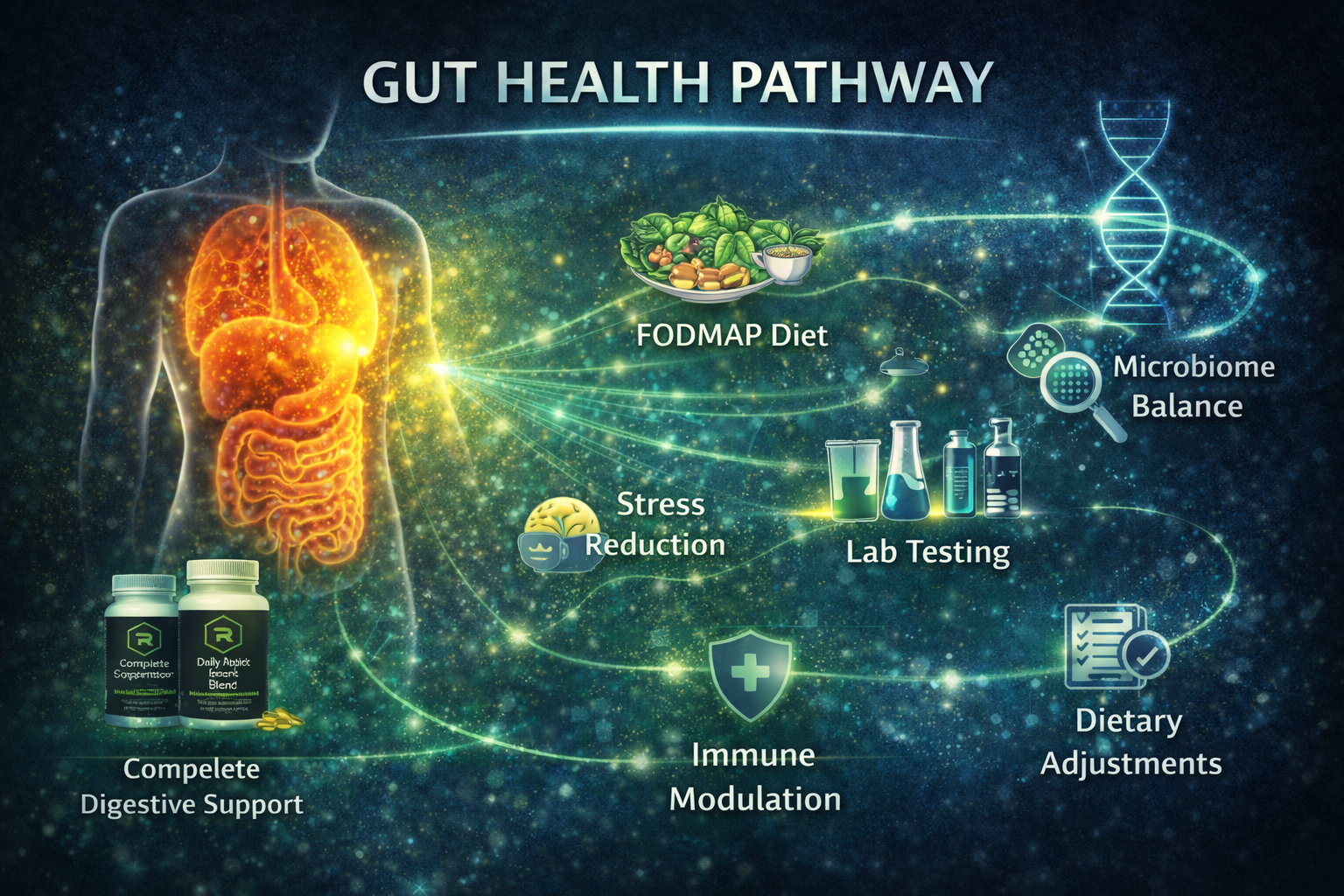 A structured, clinician-designed approach that restores digestion, balances the microbiome, calms immune and inflammatory signaling, and rebuilds long-term gut resilience at the root cause level.